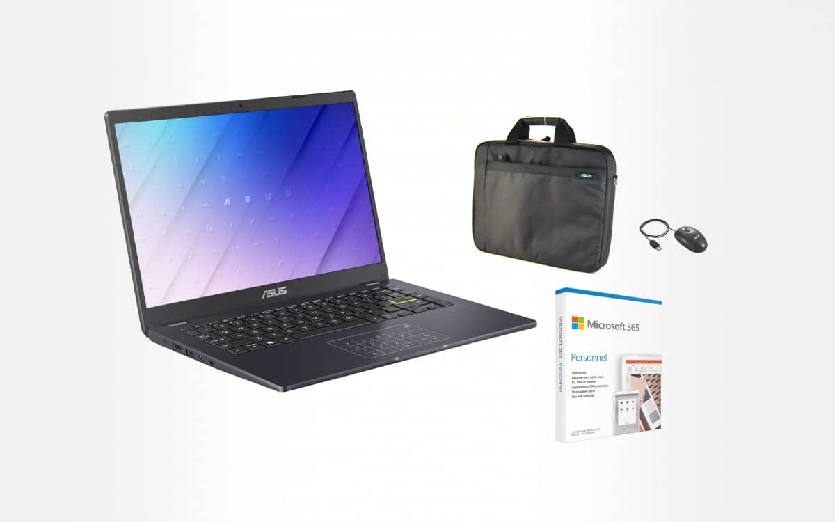 Pour ceux qui ont un budget modeste, l’Asus Vivobook 14 E410MA-EK971TS sort du lot. Pour moins de 400 euros chez Rue du Commerce, l’offre comprend étui, souris et un an de Microsoft Office 365. L’alliance d’un écran Full HD de 14 pouces, d’un Pentium N5030 (quatre cœurs à 3,10 GHz), 128 Go de SSD et 4 Go de RAM assure la polyvalence attendue au quotidien. Le tout pour à peine 1,3 kg sur la balance.